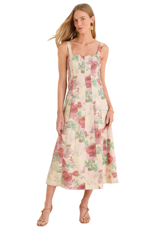 - What a stunning silhouette on this linen midi. The corset style bodice and decorative buttons are so romantic. It is an exquisite choice for a spring wedding guest look when paired with pearl earrings.