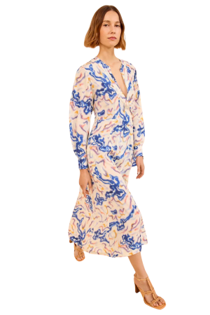 - There is nothing quite like the elegant drape of this abstract midi. The striking blue pattern is springy but unique, and makes a beautiful statement for holiday hosting, especially when styled with simple diamond studs and a sleek clutch.