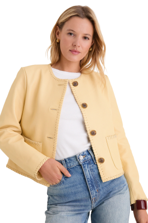 - If florals aren't your thing, how about this leather jacket and matching skirt in the prettiest butter yellow hue. The set would look great with these woven Mary Janes, or wear each piece separately with a white blouse or denim for several fresh spring looks.
