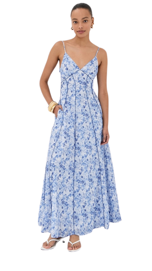 - I've been reaching for soft blues lately, making this printed maxi an absolute favorite. The contrast piping adds such a sophisticated touch for evening events, while the cotton fabric keeps it comfortable for daytime wear.
