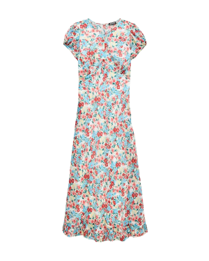 - This cheerful floral midi dress practically begs to be worn to a spring celebration. The ruffled hem adds beautiful movement. I would wear this with my favorite cream knit thrown over my shoulders for casual days, and strappy heels for a bridal or baby shower.
