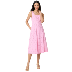 - Under $100, simple and timeless, I love the feminine details on this pink eyelet midi. It even has pockets! Pair it with espadrilles for a sunny brunch, or dress it down with white sneakers for running errands this spring.