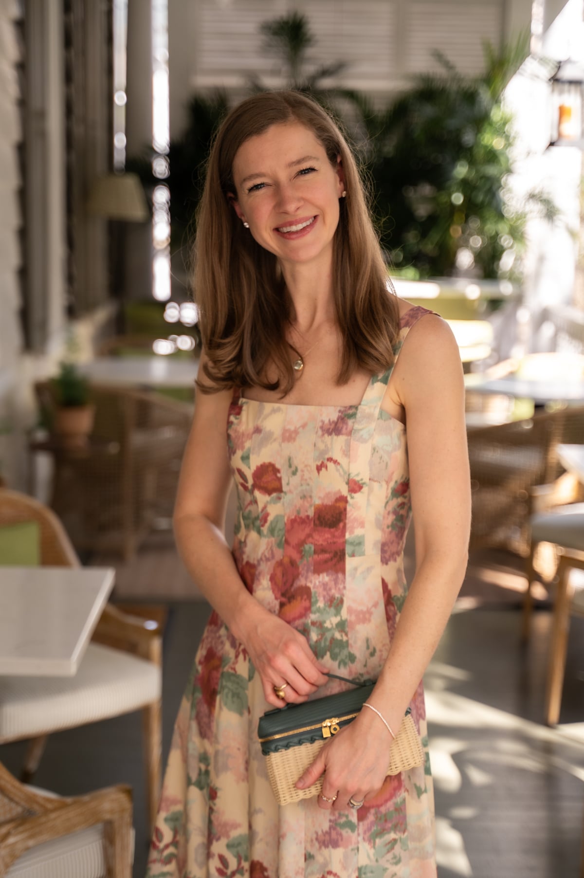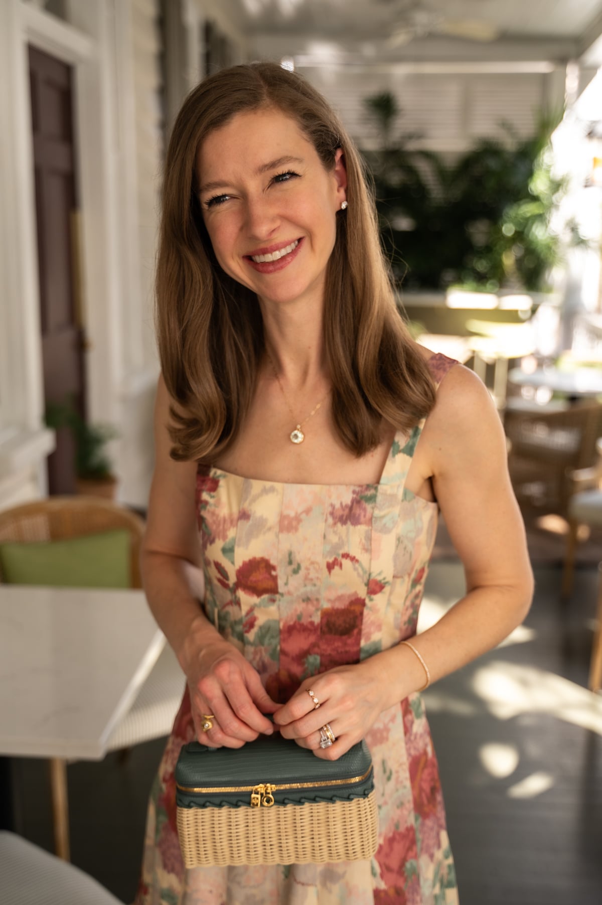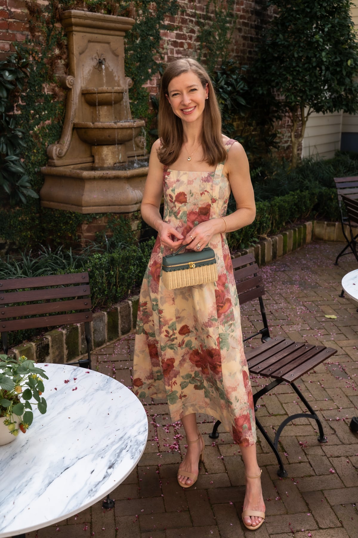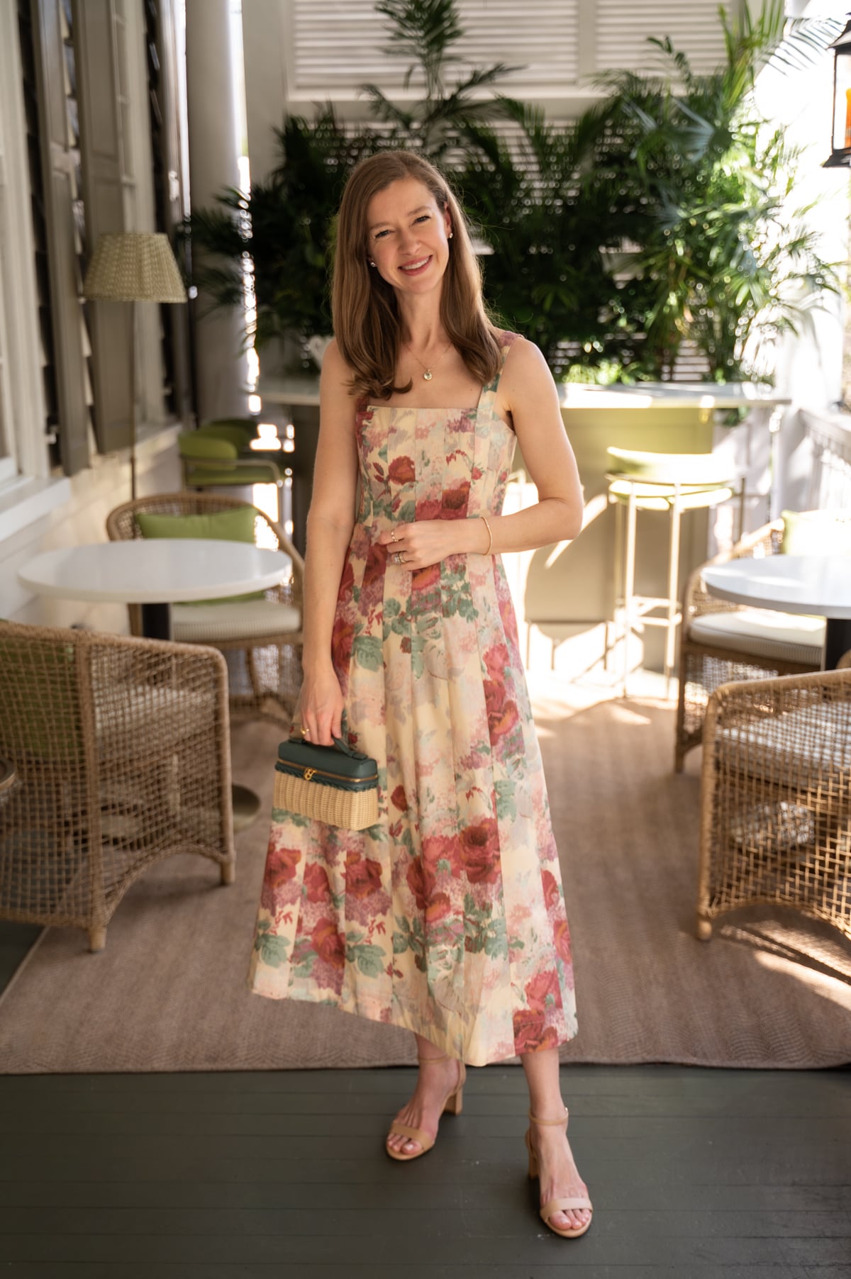 - This romantic ikat floral midi dress offers Emilia Wickstead style for under $300. (I'm wearing the smaller of my two normal sizes.) It is perfect for Easter Sunday with my go-to block-heeled sandals, and you can easily dress it down with flat sandals for weekend brunches later this spring. The pattern has so many beautiful colors you can pick up in your accessories. I liked playing up the teal/aqua hues with the green amethyst pendant necklace David bought me for Valentine's Day, and this teal wicker bag. The bag is a splurge for sure, but I found two that have a very similar look for a fraction of the price, such as this beautiful version with bamboo toggles and this one (under $100), both of which would pick up the pretty chestnut hues in the dress.
