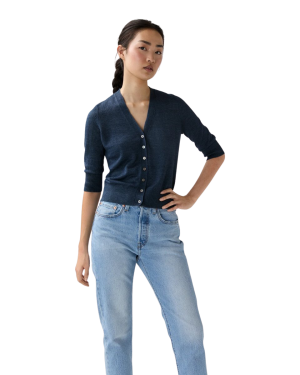 - The linen version of Ann Mashburn's beloved Rosie in deep indigo is perfect for warm weather. I wore it buttoned up as a top with white shorts and gold sandals for a casual evening look.