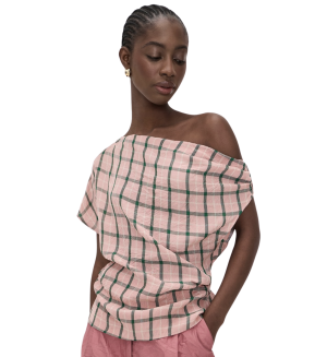 - How pretty is this pink plaid off-shoulder top? The draped silhouette feels effortlessly chic, and I love it with white shorts and strappy sandals.