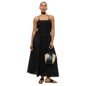 - This smocked dress is organic cotton (love!) and a little bit sheer making it a chic beach coverup. For more coverage try the black version which looks amazing with white accessories.