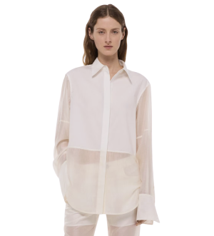 - This tuxedo-style shirt is so chic over white shorts. I love that the body is opaque but the sleeves are sheer.