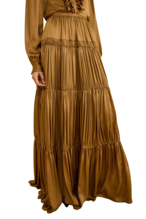 - Since temps will hover around freezing, I love a piece that covers you up a bit and this silk blouse and matching skirt look incredible with heels or boots. (They’re a lovely soft olive silk, though the color looks golden on the website.)