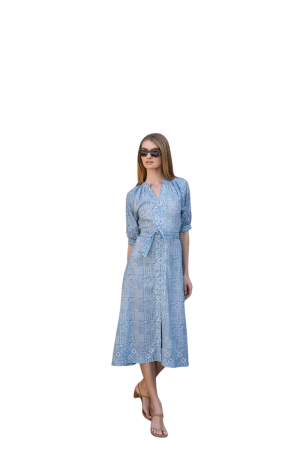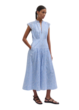 - The eyelet details on this blue cotton maxi give it such a feminine, graphic lift. It is fully lined and breathable, making it the perfect piece to wear to weekend brunch with a woven tote and flat sandals.