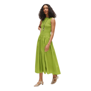 - If you need an effortless daytime look, this green smocked dress is chic and comfortable. Toss it on with a cardigan and white sandals (love these!) for morning errands, then switch to wedges for evening plans.