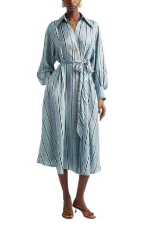 - You will reach for this striped silk shirtdress for years to come. The billowy sleeves and belted waist create a gorgeous silhouette. Simply add strappy heels and gold jewelry for a springtime baby shower or graduation.