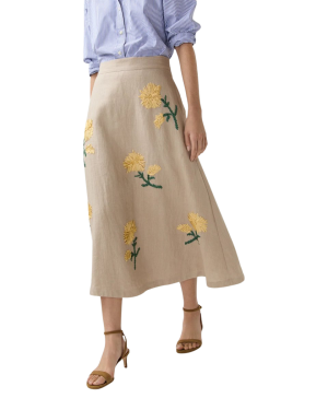 - How darling is the yellow floral embroidery on this linen skirt? The A-line shape is incredibly flattering. I would style it with a crisp white tee and flat sandals for an easy, breezy daytime look.