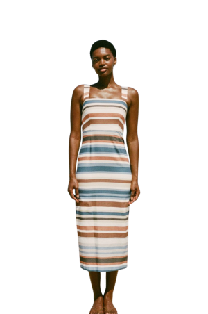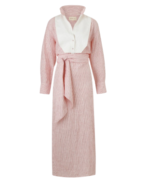 - There is something so charming about the contrasting white bib on this striped linen dress. It has a wonderfully relaxed feel for weekend farmer's market runs. Roll up the sleeves and pair it with simple leather slides.