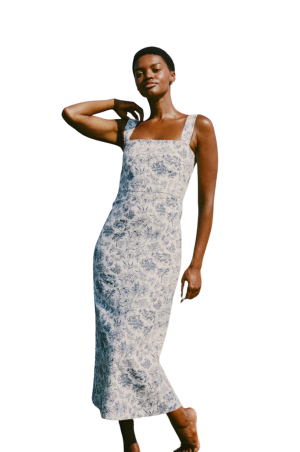 - The elegant silhouette of this blue toile maxi dress instantly caught my eye. It is an effortless choice for baby showers or daytime garden parties.