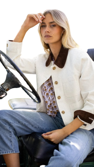 - White denim feels so fresh for the season, especially in the shape of this cropped barn jacket. The contrasting corduroy collar gives it a wonderful heritage feel and the cropped style is especially flattering with high-waisted jeans.