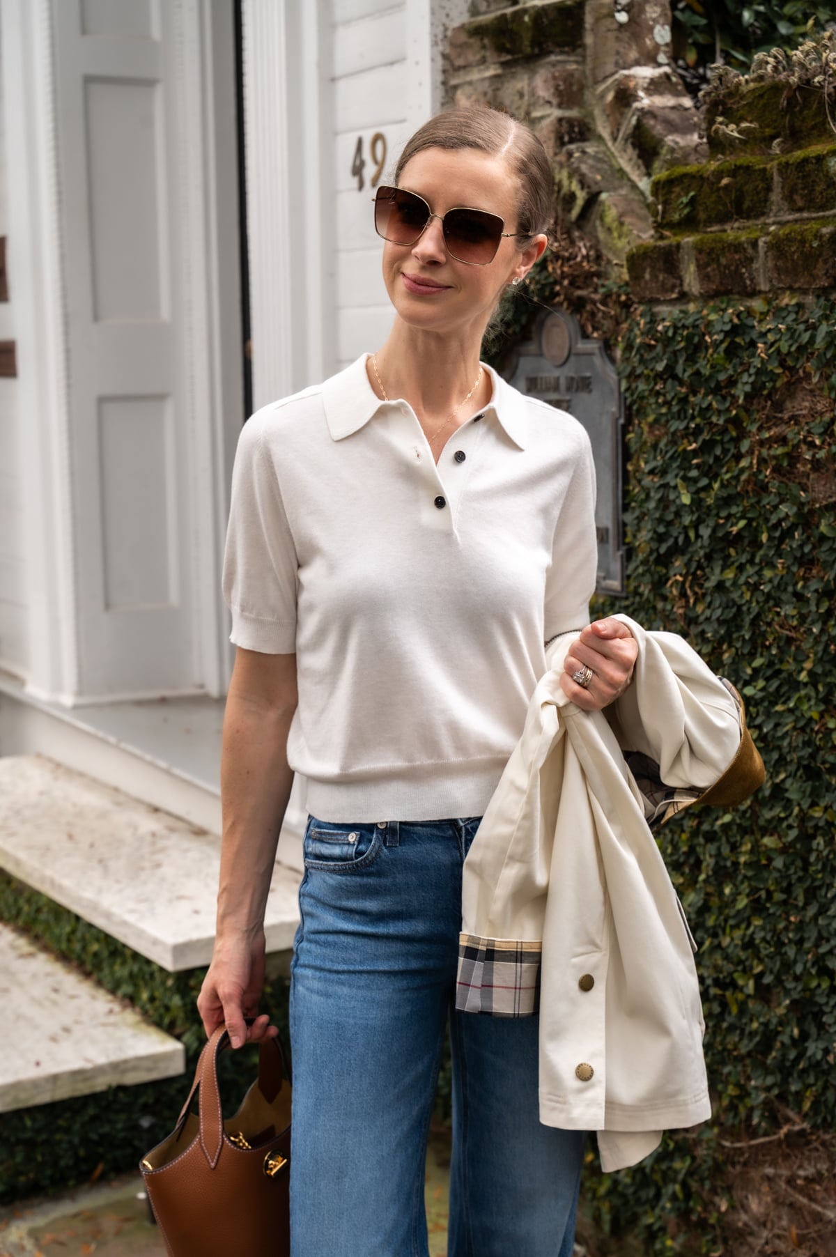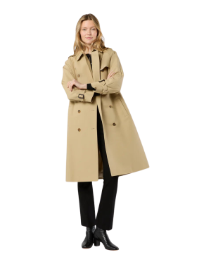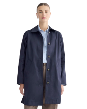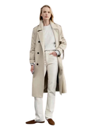 - If you need a reliable staple, this cotton trench drapes beautifully. I love wearing a cashmere-silk shawl as a scarf (my latest acquisition!!) with white denim and these chic ballet flats for in-between weather days. The below-the-knee length is so chic and the crisp Italian cotton fabric is inspired by Burberry's iconic trench. So good!