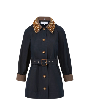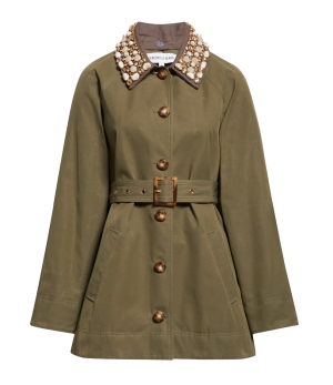 - You can never go wrong with olive green, and this belted coat has a stunning removable jeweled collar. Pair it with dark denim and classic loafers for an afternoon of museum hopping or looking fab checking off your everyday to-do list. The olive is selling out but the navy version is also very chic!
