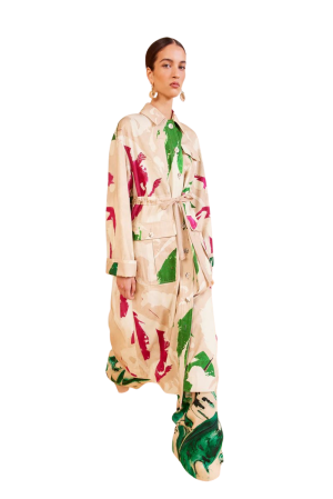 - Make a bold statement with this beautiful linen coat. The multicolored artistic print is a joyous celebration of spring hues. Cinch the waist over a simple white dress for church, or wear it open over wide-leg pants for an artsy gallery visit.