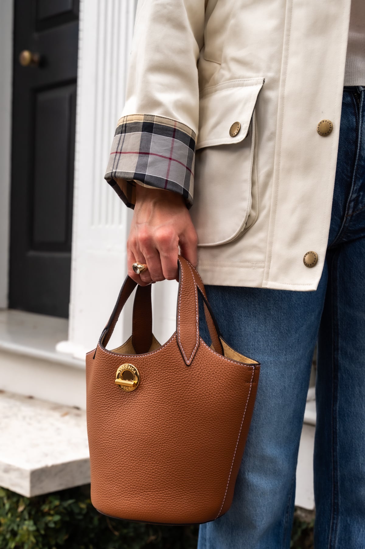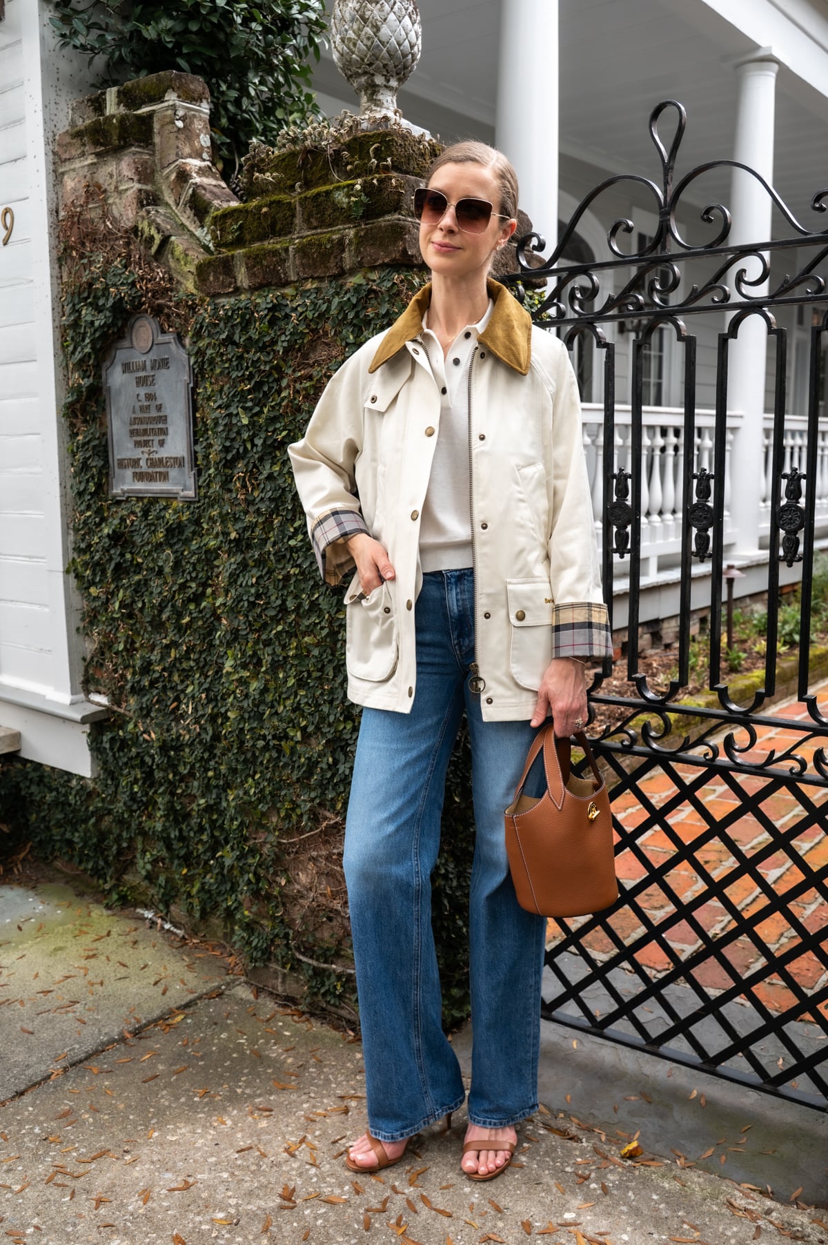- I love the crisp off-white hue of this waxed jacket. The moment I saw it I had to have it! (I got my normal size UK 8.) The lighter color is an easy spring update to your trusty olive wax jacket, and I'm warning you now, you're going to see a lot of this little bucket bag. (I love it so much, I got it in two colors.)