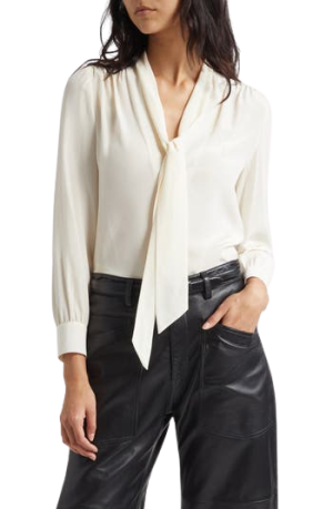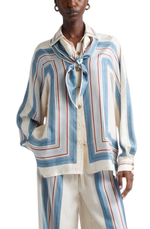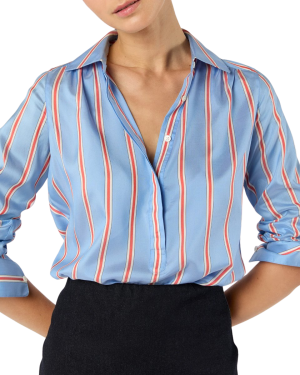 - This gorgeous striped silk blouse looks great at the office with trousers now, on vacation with white shorts, and a random Saturday with jeans.