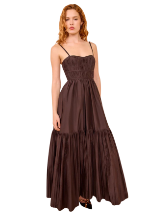- This brown silk maxi dress is so striking, and can work year round with different accessories. I'd pair with a black clutch and heels now, and shell earrings or a colorful clutch in warm weather.