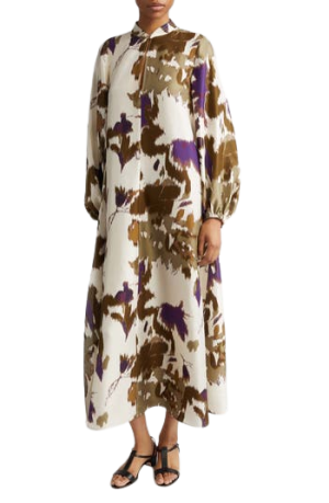 - The print on this silk twill dress is stunning and will look amazing on a warm weather getaway now, and every event this summer.