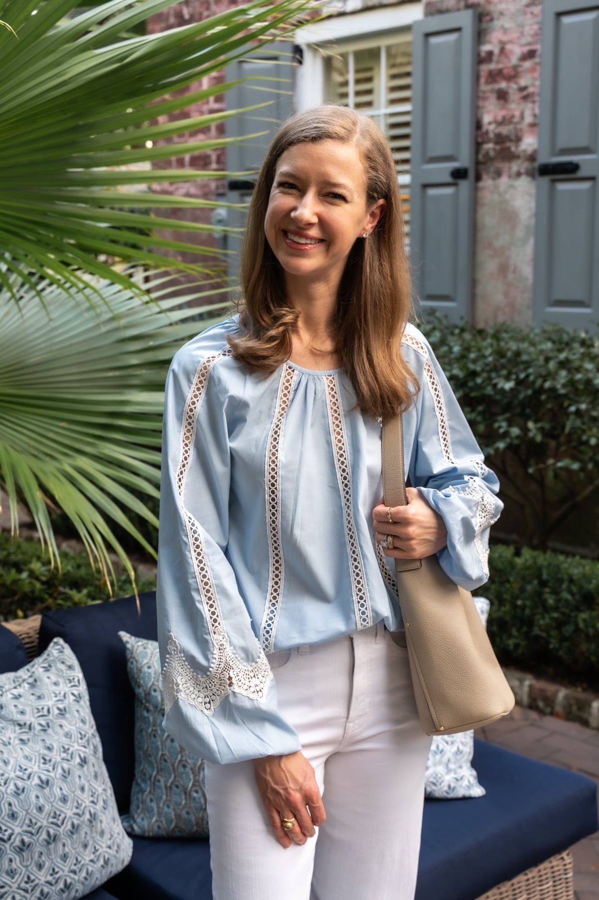 - A crisp pale blue lace blouse (on sale under $100!) is wonderfully versatile for the transition into warmer weather. It feels polished enough for the office with tailored trousers, but easily dresses down with white shorts on vacation. Scroll down for photos of this beautiful top. It's such a steal!