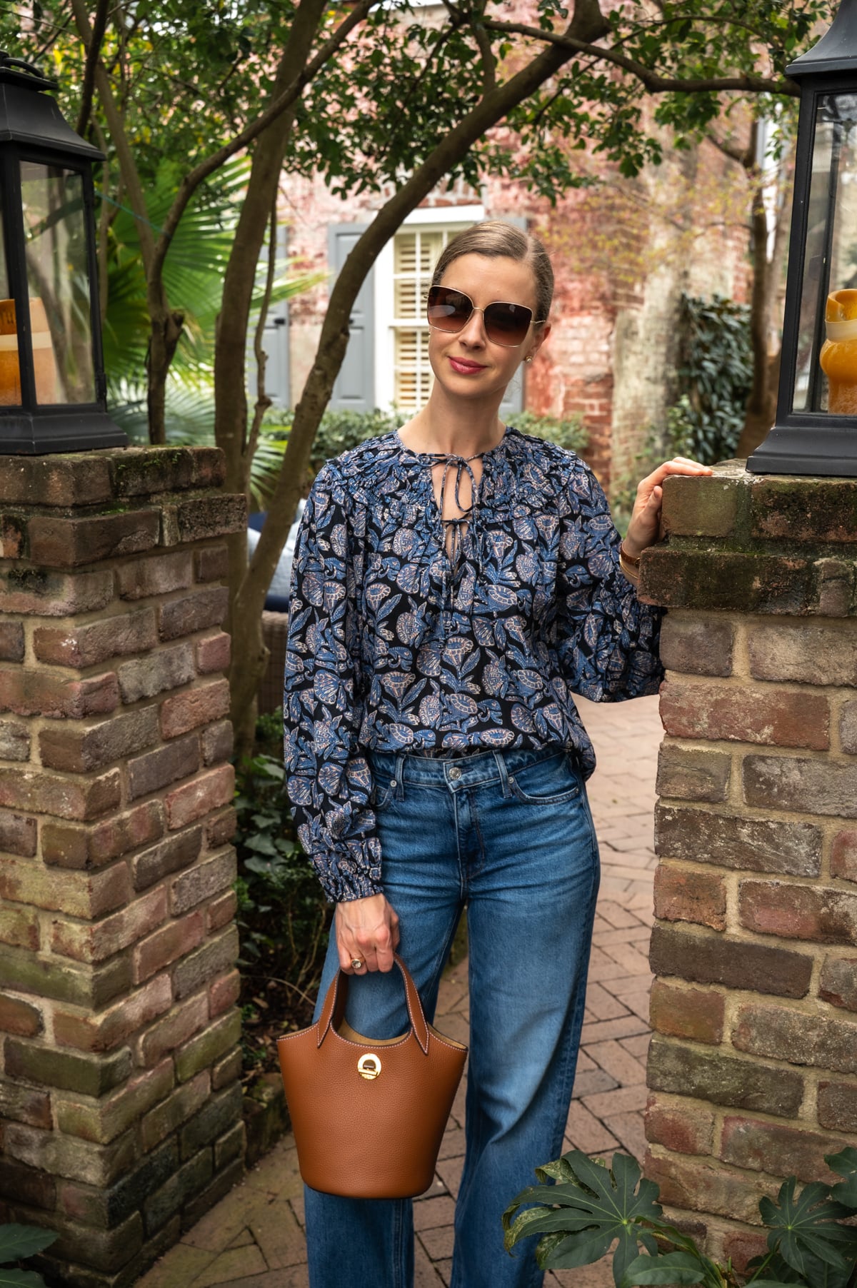 - I love the moody blues in this romantic cotton blouse. The voluminous sleeves make such a statement, so I'd keep the rest of the look simple. Every great top needs a perfect base, and these straight jeans in "stoked" are my current go-to. (I'm wearing the long length above, but own both regular and long.) They have just the right relaxed fit and look incredibly chic paired with any of the statement blouses on this list. (They really are as good as everyone says!)