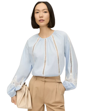 - A crisp pale blue lace blouse (on sale under $100!) is wonderfully versatile for the transition into warmer weather. It feels polished enough for the office with tailored trousers, but easily dresses down with white shorts on vacation. Scroll down for photos of this beautiful top. It's such a steal!
