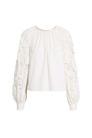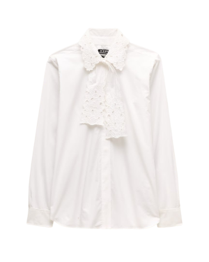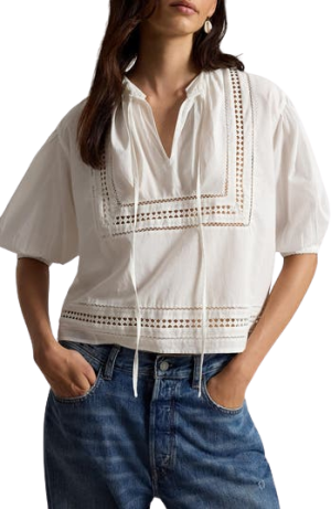 - Such a sweet boxy shape on this lightweight cotton shirt. The delicate front ties and airy lace inserts make it an ideal companion for high-waisted denim and espadrilles on a warm, sunny afternoon.