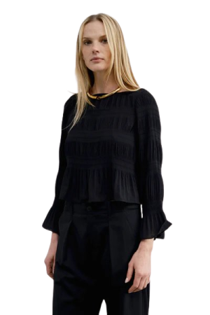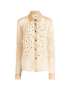 - Apologies in advance, but I have to show you the intricate details on this sheer silk organza top. It's truly breathtaking. With its hand-applied ribbon flowers, it is an investment piece you will reach for on special date nights or spring events for decades. Perfect with simple black trousers and a red lip.