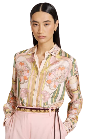 - An elegant silk piece like this pink printed shirt instantly brightens your mood. The hand-printed tulip motif is so striking for the office, yet feels entirely appropriate for a nice dinner out. I'd even pair it with high-waisted shorts on vacation.