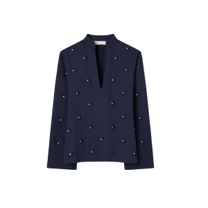 - I love this stunning navy tunic so much. The subtle sequin embellishments catch the light beautifully, making it an effortless option to wear from a daytime boat ride straight to dinner.