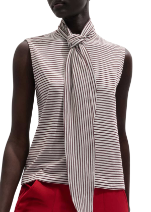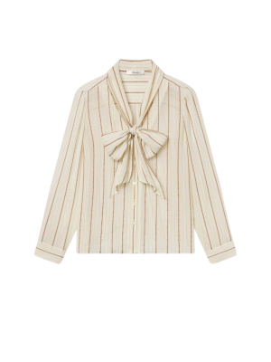 - Soft neutral stripes on this sheer striped blouse give it a beautifully relaxed, earthy feel. I would wear this tied loosely at the neck with your favorite worn-in denim now, and linen trousers later.