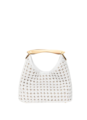 - The open weave and gold metal handle on this white leather top-handle bag are so striking. It's a great size for both daytime and evening looks.