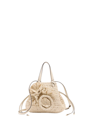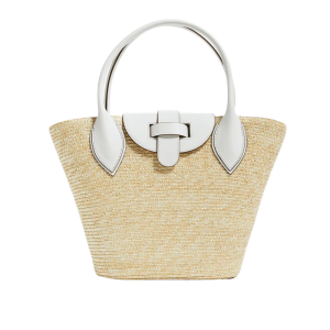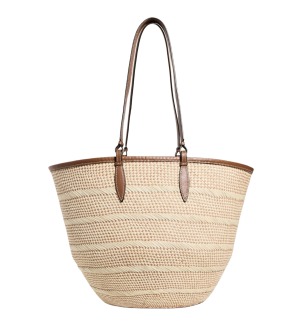 - The shape and white leather details on this straw bag are so fresh. An unusual beach bag that holds a lot and looks great stuffed with a towel or shopping around town.