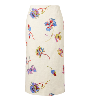 - A gorgeous print on this cream skirt works with a tank top and strappy heels on vacation and pastel cashmere sweaters as you yearn for spring back home.