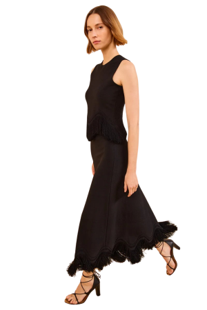 - For a dramatic evening look, this black knit fringe skirt is a showstopper. Amazing with a black cashmere turtleneck and statement belt now, then swap for the matching top and sandals later.