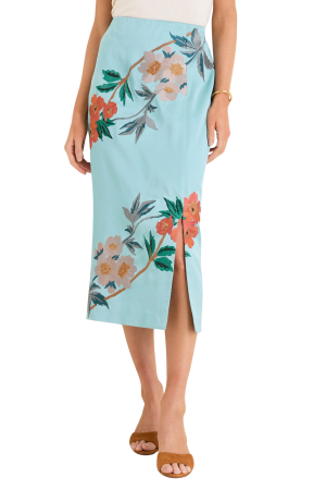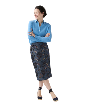 - Sequin embroidered florals give this pencil skirt such gorgeous depth. I'd pair it with a bright cashmere sweater now and a silk blouse for spring dinners. So special for the holidays, too.