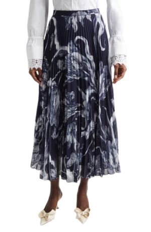- Pleating and botanical prints belong together, and this navy voile midi skirt from Erdem proves it beautifully. The price feels steep since it isn't silk, but would definitely watch to see if it goes on sale.