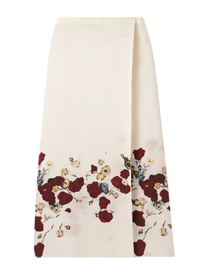 - Cream organza with scattered red florals makes this midi skirt absolutely stunning. Styling the model with a leather bomber is atrocious, I'd go for a soft brown cashmere like this and brown heels now, then cream accents later.